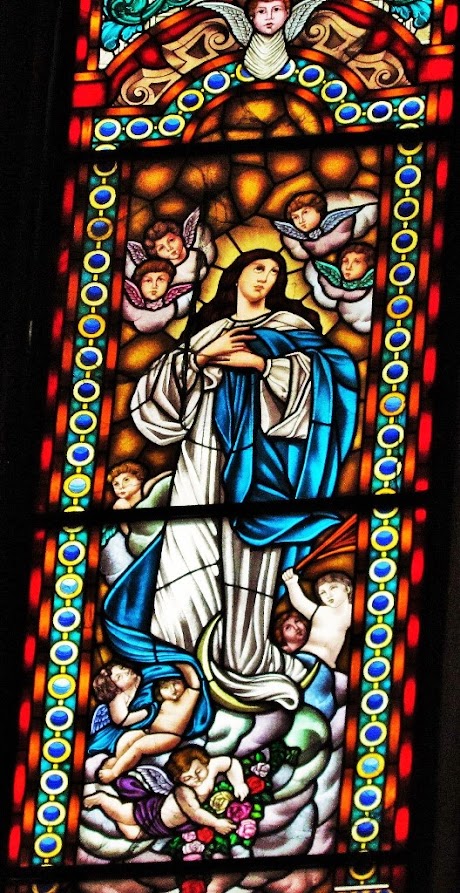 The church has three naves with five bays, the main nave being larger than the sides. The east side has a transept and an apse with three chapels. The transept is illuminated through the monumental windows in the arms of the transept and chancel, as well as by a small rose window over the chancel with tracery in the shape of a pentagram.